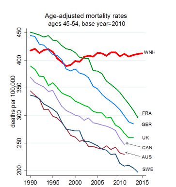 Here's the Brookings Institute that backs up the data above. Read it and weep, or not. A pertinent question might be: Why are poorly-educated American non-Hispanics dying at nearly twice the rate as Swedes, while African-American and Hispanic mortality rates continue to track downward?